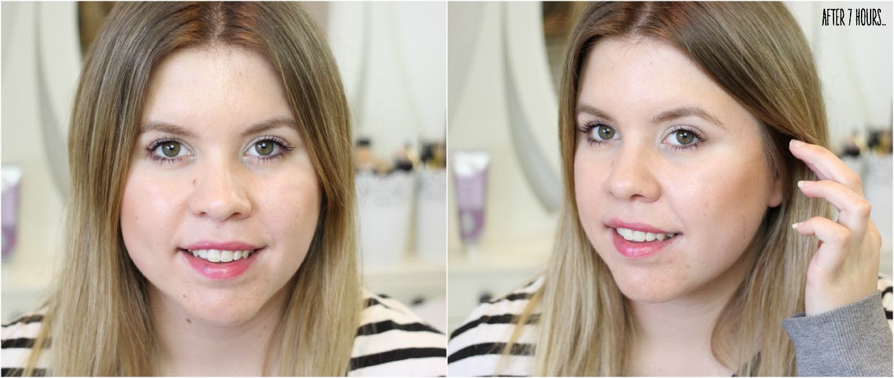 EXCUSE THE HORRIBLE WORN LIPSTICK LOL. After just under 7 hours (by like 10 minutes) the foundation is looking a little more worn. As you can see it’s got a bit more of a glow to it which doesn’t look awful. I’ve also lost some coverage around the chin area which is weird… It’s although it’s patched off? My skin is a little drier in that area but usually that makes foundations cake rather then patch off completely.