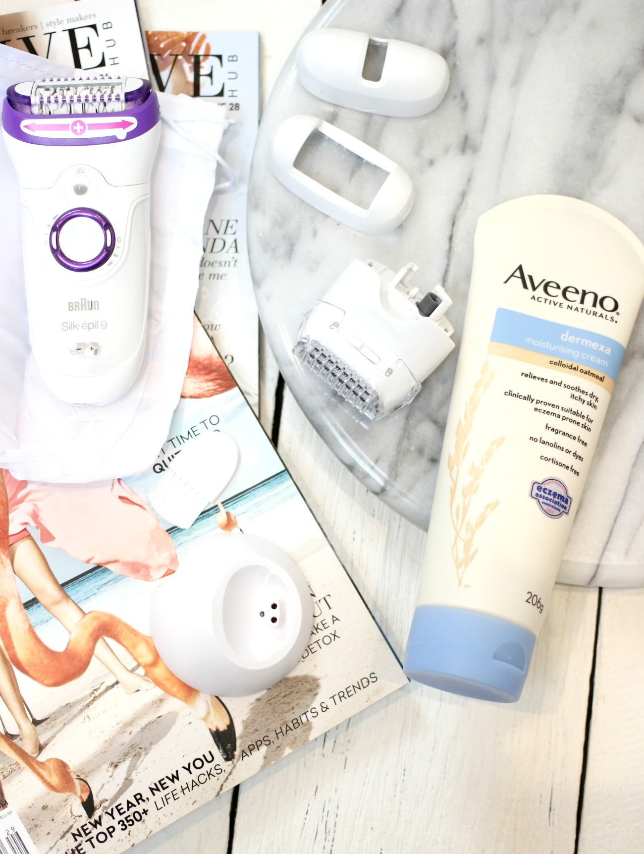 We’re now at my current situation and I’ve been introduced to a life changing product which is the Braun Silk - Epil 9. It’s a life changing product for me! I use this on my stomach, arms, bikini line and legs without any issues at all. It IS painful to start off with but after a few goes it does get less painful (a claim on the package I totally scoffed at me I received it). It has a few different attachments for different things and you can use it in the water if you prefer as well. I find I only have to use it once every two weeks at the moment which is amazing. The results are comparable to waxing but you can do it at home and I find it a little more gentle on the skin. I always follow up with the Aveeno Dermexa Moisturising Cream but it’s cooling, gentle and super hydrating. It helps soothe the skin and moisturise the area.