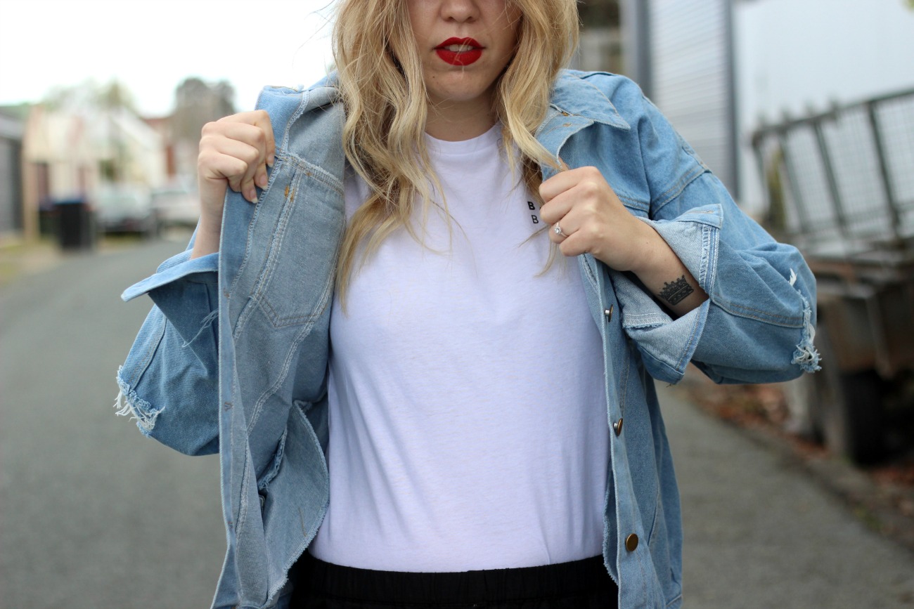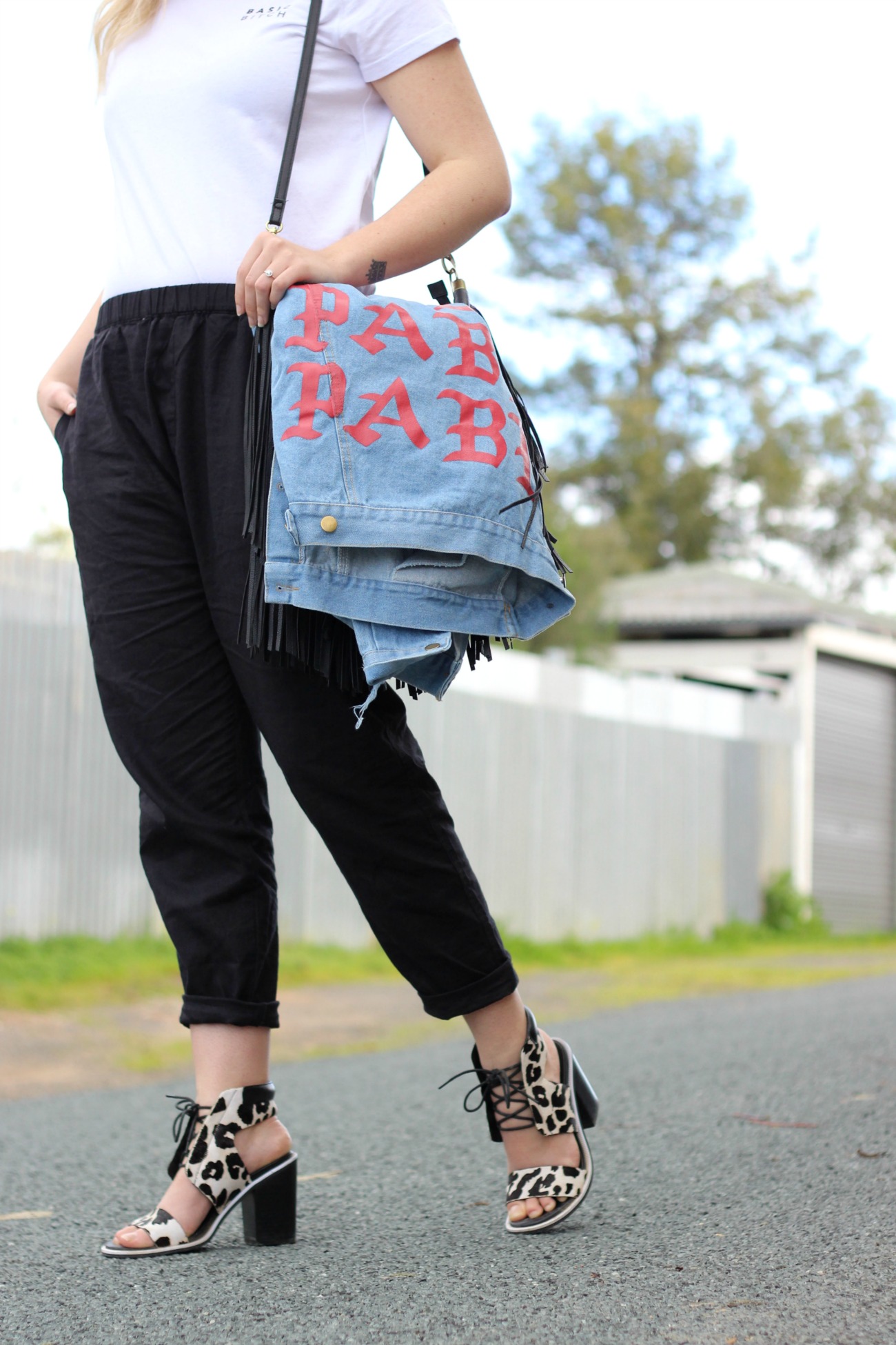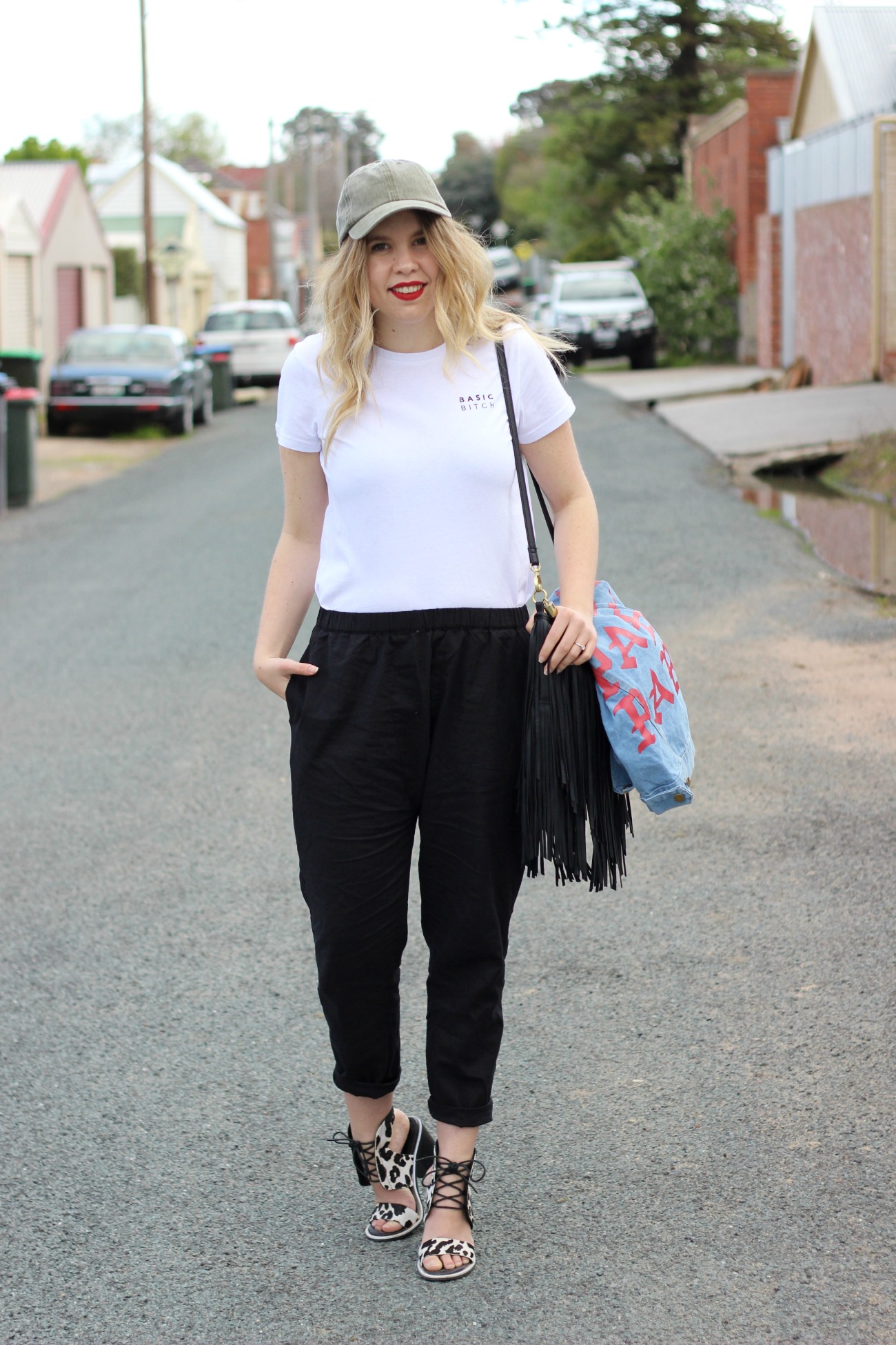 What I’m wearing: Nude Lucy Metta Slouched Pants | Senso Riley |Nude Lucy X Peppermayo ‘Basic Bitch’ | Blue Letter Print Ripped Denim Jacket | Cotton On Body Cap | H&M Bag (not current)