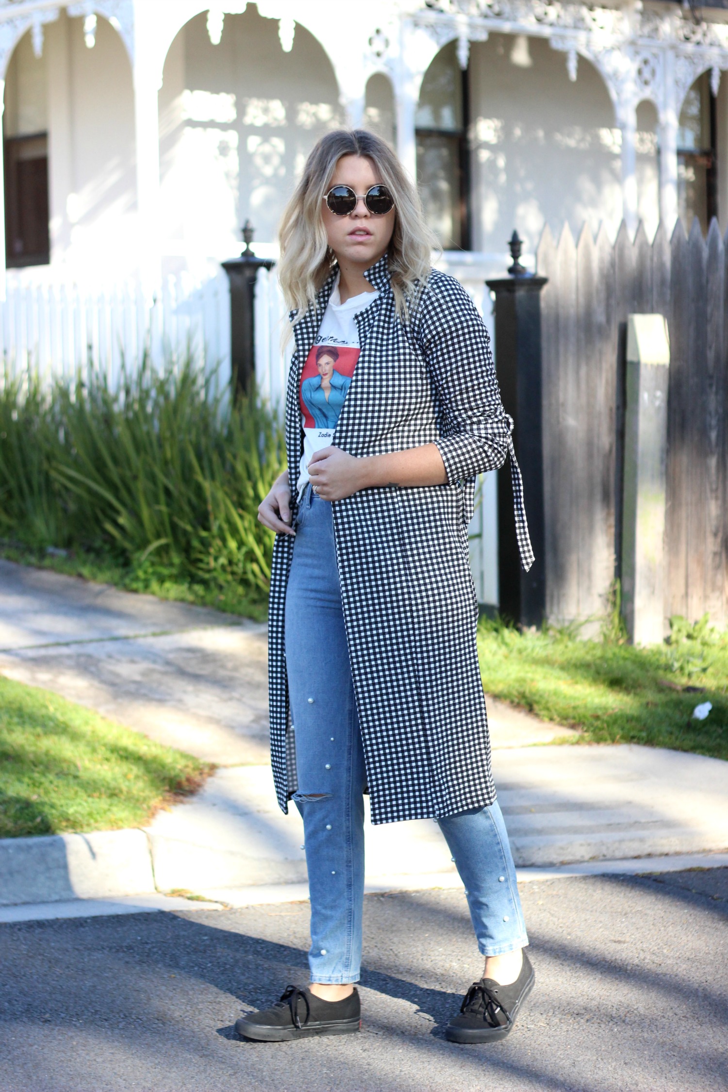 What I’m wearing: Hannah Slim Fit Pearl Detail Mom Jeans (size 10) |Eva Gingham Tie Cuff Duster (size 8) | The Gentlewoman Tee | Raen Round Sunglasses | Vans Mono Classic Sneakers